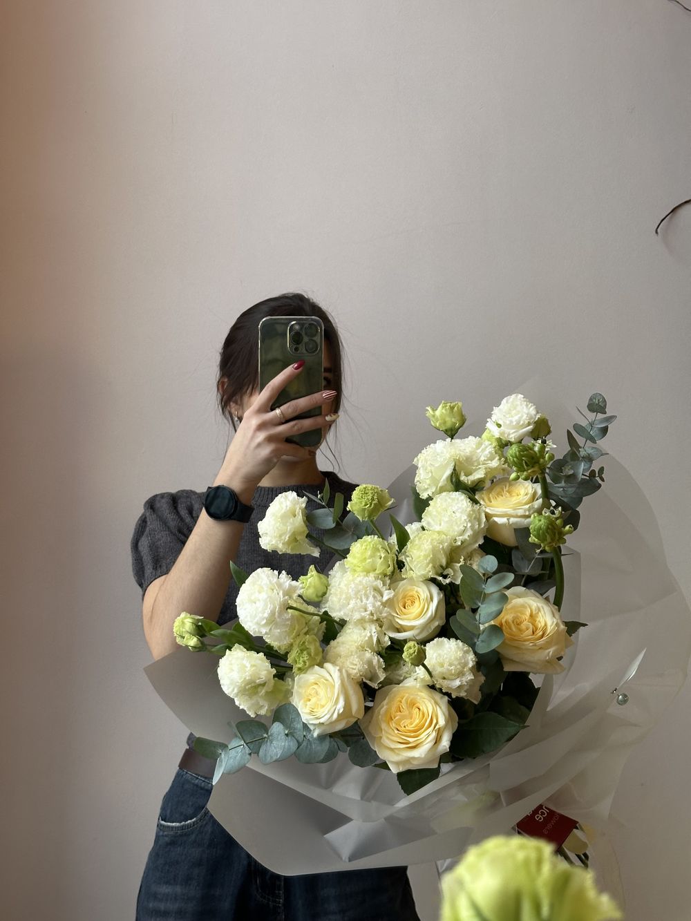 Пионовидные розы, эустома, эвкалипт Транспортировочная коробка: Бесплатно Открытка: Бесплатно Подкормка Chrysal: Бесплатно Примерные размеры: Ширина: 40см Длина: 60см