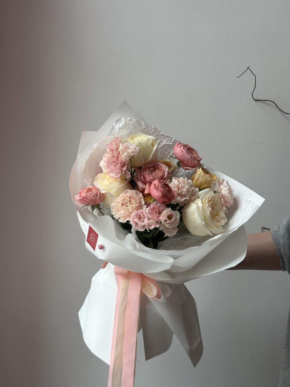 Пионовидные розы, диантусы, тюльпаны Транспортировочная коробка: Бесплатно Открытка: Бесплатно Подкормка Chrysal: Бесплатно Примерные размеры: Ширина: 40см Длина: 60см