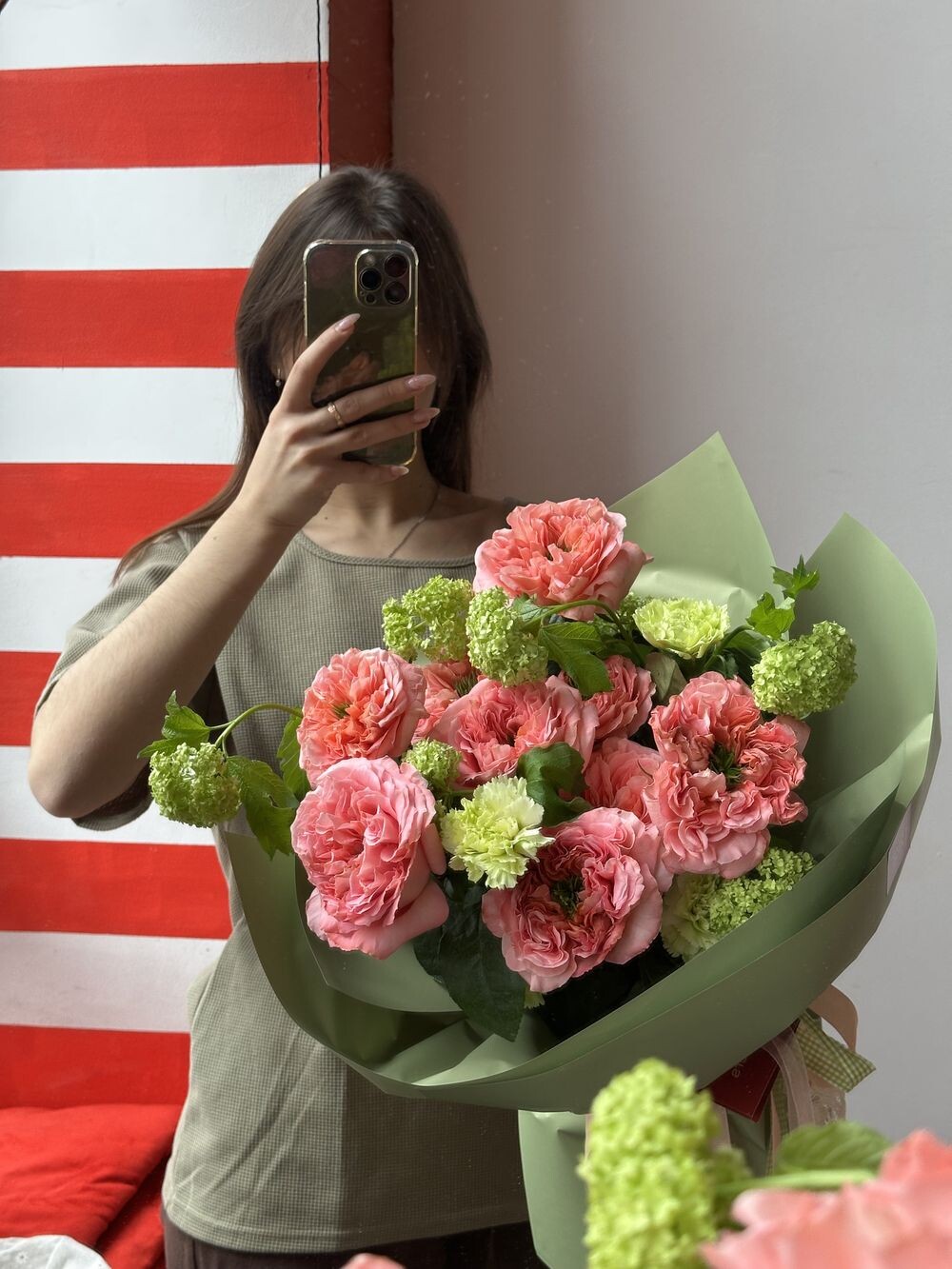 Вибурнум, роза сорта Мандарин, диантусы Транспортировочная коробка: Бесплатно Открытка: Бесплатно Подкормка Chrysal: Бесплатно Примерные размеры: Ширина: 40см Длина: 50см