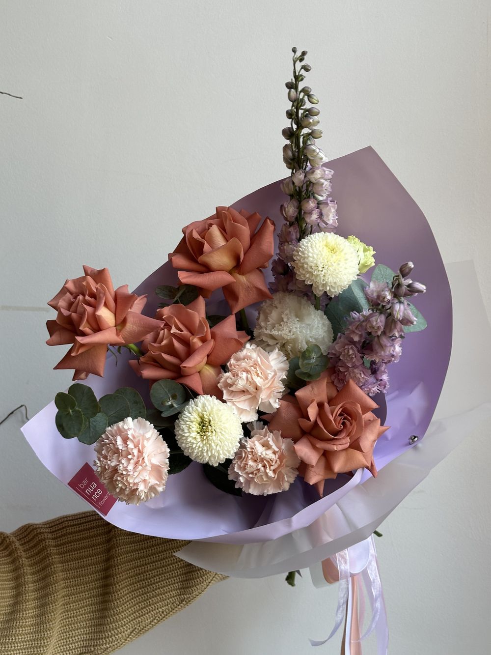 Французские розы, дельфиниум, хризантема, диантусы Транспортировочная коробка: Бесплатно Открытка: Бесплатно Подкормка Chrysal: Бесплатно Примерные размеры: Ширина: 40см Длина: 50см