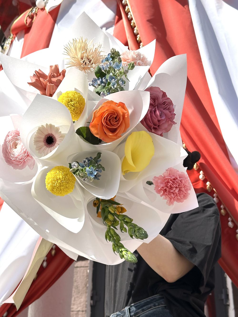 Гербера, орнитогалум, пионовидная роза, оксипеталум, ранункулюс, хризантема Транспортировочная коробка: Бесплатно Открытка: Бесплатно Подкормка Chrysal: Бесплатно Примерные размеры: Ширина: 50см Длина: 60см
