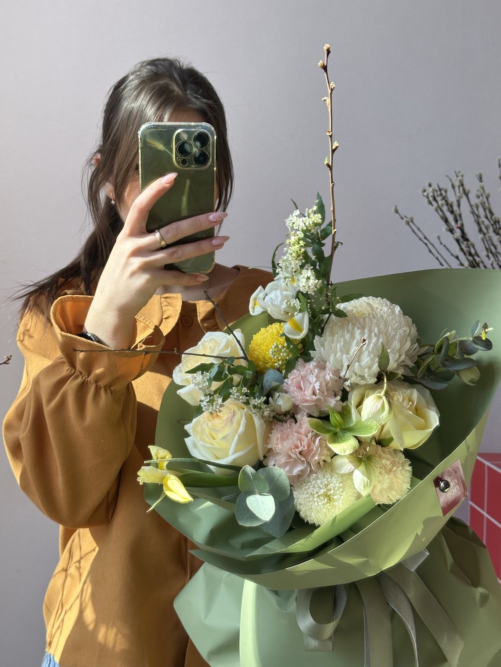 Хризантемы, пионовидные розы, диантусы, хелеборус, декортивная зелень Транспортировочная коробка: Бесплатно Открытка: Бесплатно Подкормка Chrysal: Бесплатно Примерные размеры: Ширина: 40см Длина: 60см