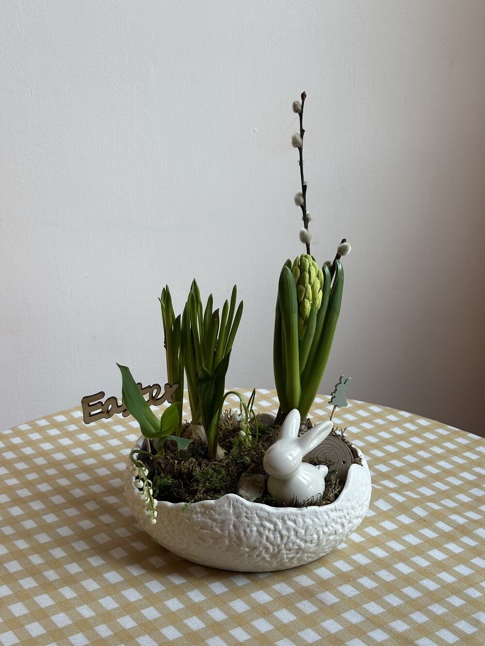 Гиацинт, мускари, ландыш, верба, керамический зайчик Транспортировочная коробка: Бесплатно Открытка: Бесплатно Примерные размеры: Ширина: 15см Длина: 20см
