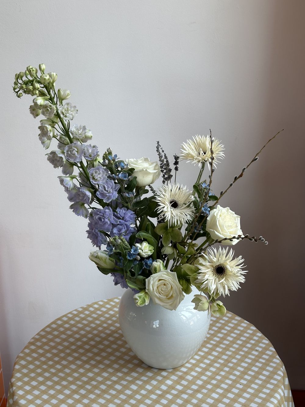 дельфиниум, герберы, оксипеталум, пионовидные тюльпаны, розы, лаванда Транспортировочная коробка: Бесплатно Открытка: Бесплатно Подкормка Chrysal: Бесплатно Примерные размеры: Ширина: 30см Длина: 60см