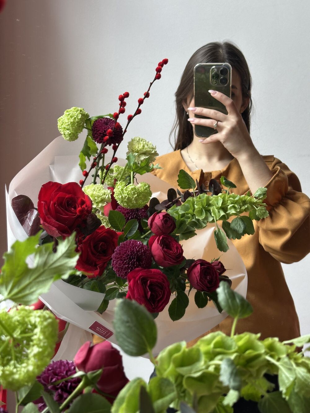 Кустовая роза, хризантема момоко, вибурнум, молюцела, диантусы, декоративная зелень Транспортировочная коробка: Бесплатно Открытка: Бесплатно Подкормка Chrysal: Бесплатно Примерные размеры: Ширина: 40см Длина: 60см