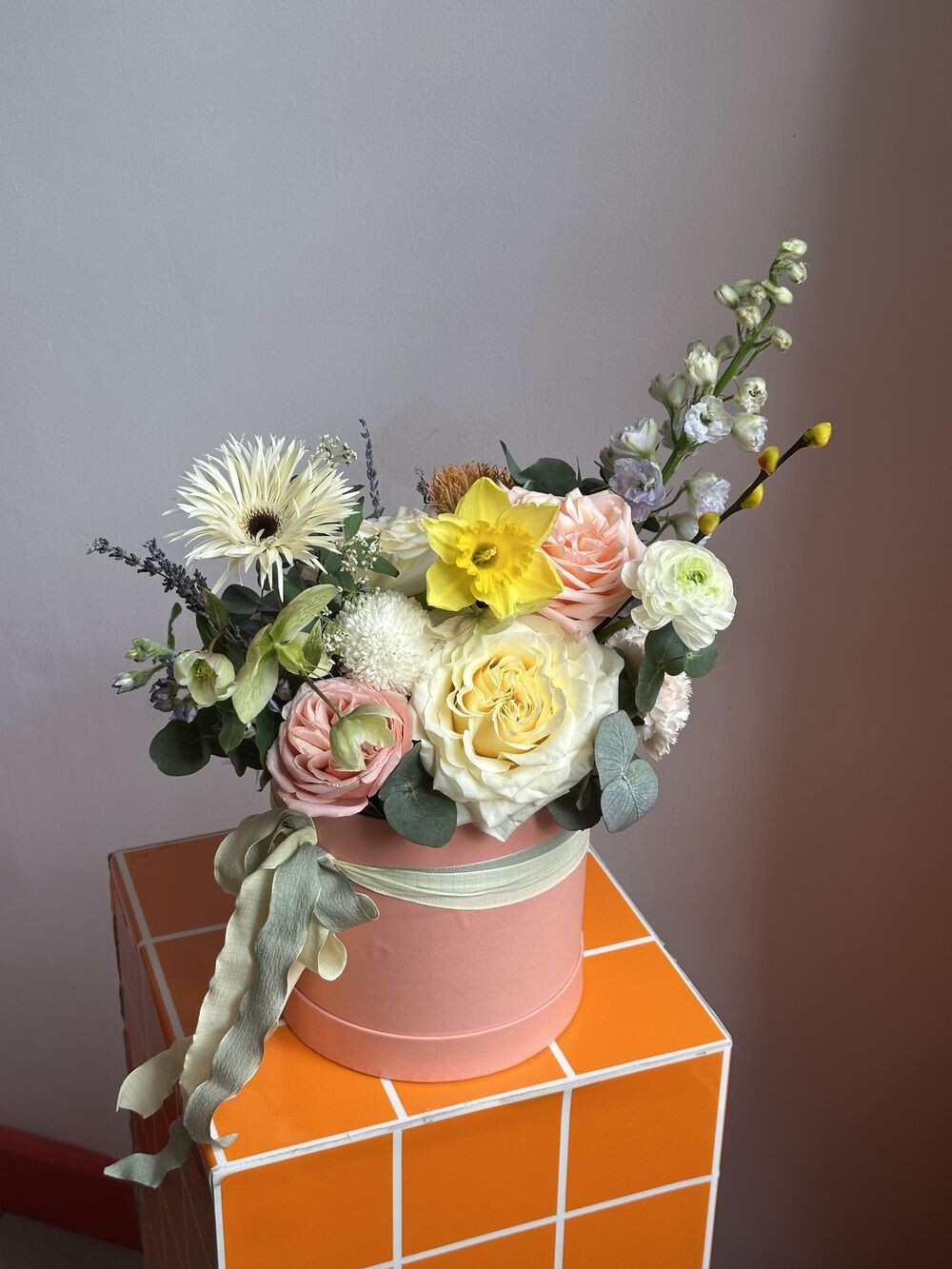 Нарцисс, гербера, дельфиниум, пионовидные розы, хризантема, декоративная зелень Транспортировочная коробка: Бесплатно Открытка: Бесплатно Подкормка Chrysal: Бесплатно Примерные размеры: Ширина: 20см Длина: 30см