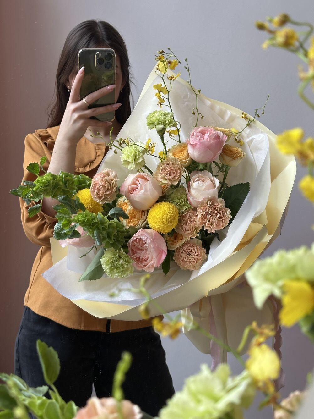 Молюцела, орхидея, хризантема момоко, диантусы, розы Транспортировочная коробка: Бесплатно Открытка: Бесплатно Подкормка Chrysal: Бесплатно Примерные размеры: Ширина: 45см Длина: 60см