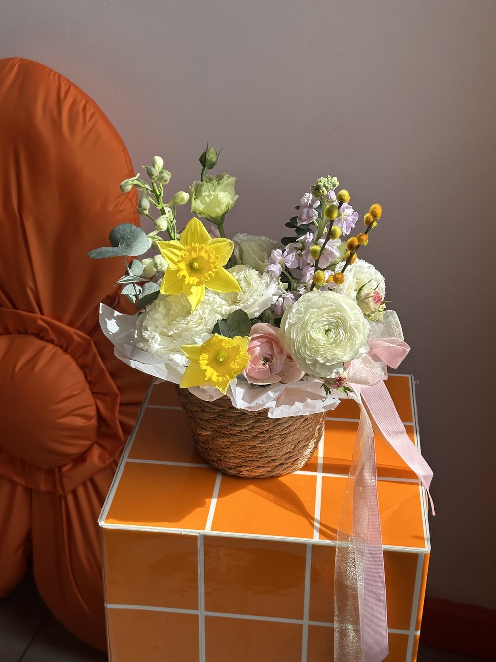 Нарцисс, ранункулюс, эустома, кустовая роза, маттиола Транспортировочная коробка: Бесплатно Открытка: Бесплатно Подкормка Chrysal: Бесплатно Примерные размеры: Ширина: 20см Длина: 20см