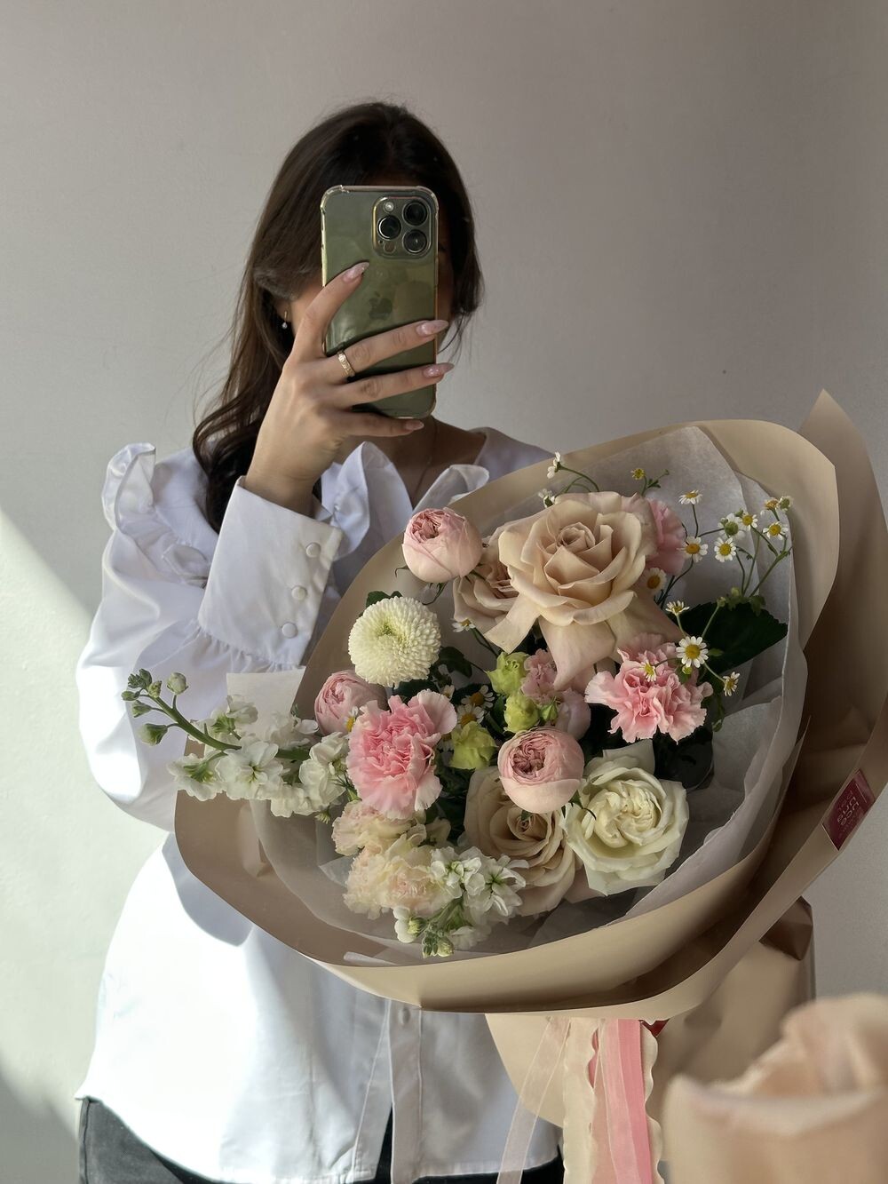 Французские розы, маттиола, ромашка, диантусы Транспортировочная коробка: Бесплатно Открытка: Бесплатно Подкормка Chrysal: Бесплатно Примерные размеры: Ширина: 40см Длина: 60см