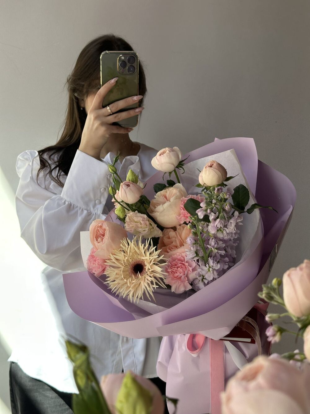 Гербера, маттиола, розы, диантусы Транспортировочная коробка: Бесплатно Открытка: Бесплатно Подкормка Chrysal: Бесплатно Примерные размеры: Ширина: 40см Длина: 60см