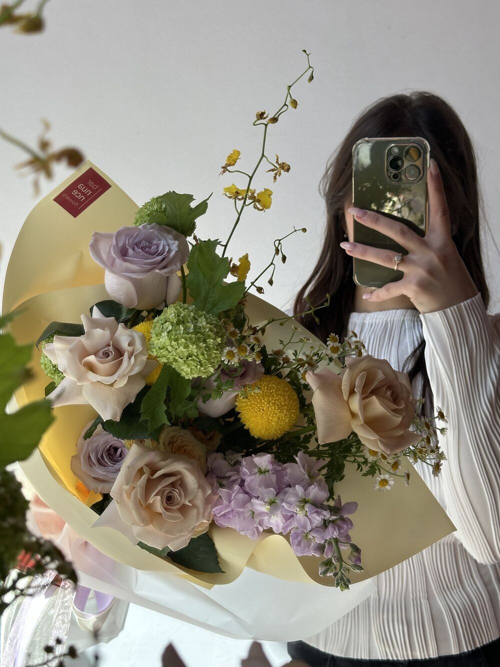 Французские розы, маттиола, вибурнум, хризантема, матрикария Транспортировочная коробка: Бесплатно Открытка: Бесплатно Подкормка Chrysal: Бесплатно Примерные размеры: Ширина: 45см Длина: 60см