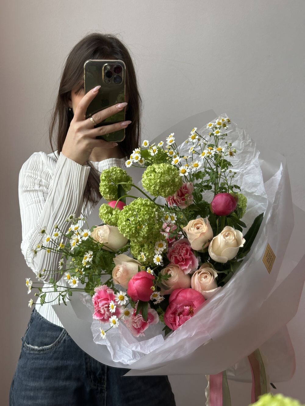 Пионы, ромашки, вибурнум, диантусы, розы Транспортировочная коробка: Бесплатно Открытка: Бесплатно Подкормка Chrysal: Бесплатно Примерные размеры: Ширина: 40см Длина: 60см
