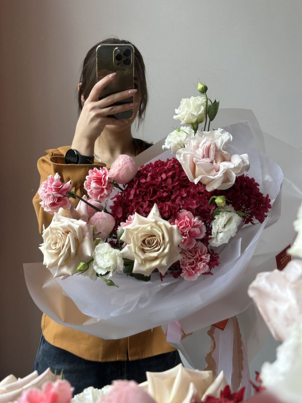 Стабилизированная гортензия, французские розы, диантус, эустома, кустовая роза Транспортировочная коробка: Бесплатно Открытка: Бесплатно Подкормка Chrysal: Бесплатно Примерные размеры: Ширина: 45см Длина: 60см