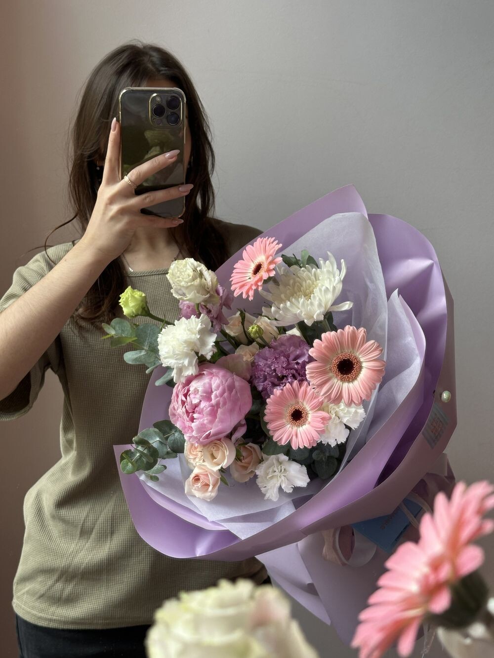 Пион, герберы, хризантема, эустома, кустовая роза, диантус, эвкалипт Транспортировочная коробка: Бесплатно Открытка: Бесплатно Подкормка Chrysal: Бесплатно Примерные размеры: Ширина: 40см Длина: 60см