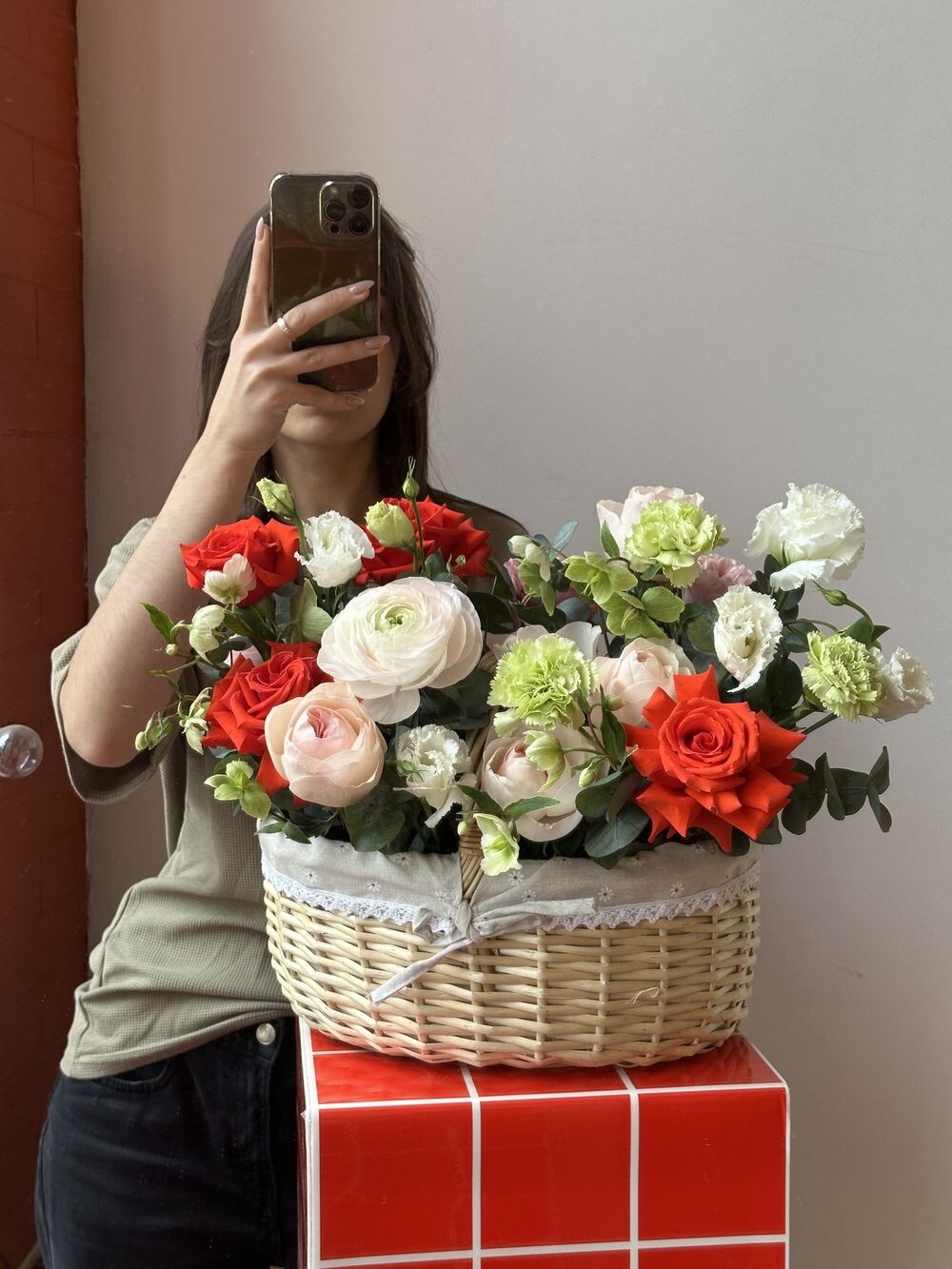 Французские розы, эустома, ранункулюс, хелиборус, диантус, эвкалипт Транспортировочная коробка: Бесплатно Открытка: Бесплатно Подкормка Chrysal: Бесплатно Примерные размеры: Ширина: 40см Длина: 30см