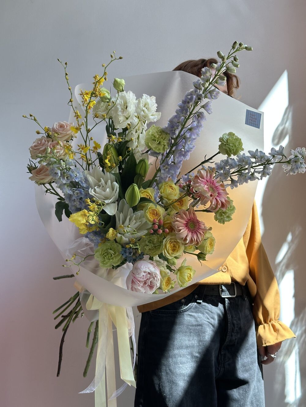Дельфиниум, пион, гербера, орхидея онцидиум, эустома, оксипеталум, гиперикум,, кустовая роза